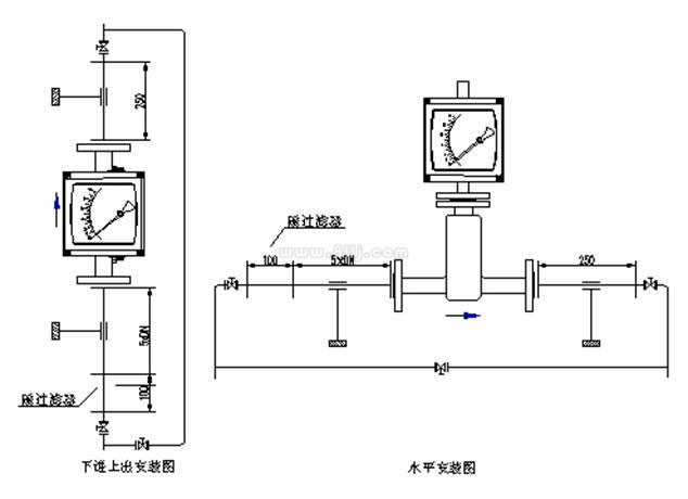 流量計(jì)垂直安裝,流量計(jì)中心線與鉛垂線的夾角不超過5°,在流量計(jì)的上游須保證五倍公稱通徑的入口直管段,下游保證250mm出口直管段。如果介質(zhì)中含有固體雜質(zhì),應(yīng)在流量計(jì)上游加裝過濾器;如果介質(zhì)中含有鐵磁性物質(zhì),應(yīng)在流量計(jì)的上游安裝磁過濾器。為了便于維護(hù)和清洗且不影響生產(chǎn),建議安裝旁通管路。為了避免由于管道引起的流量計(jì)變形,安裝法蘭必須與儀表同軸并且相互平行,并適當(dāng)?shù)刂喂艿酪员苊夤艿勒駝?dòng)和減小流量計(jì)的軸向負(fù)荷,測(cè)量系統(tǒng)中控制閥應(yīng)安裝在流量計(jì)的下游。用于測(cè)量氣體時(shí),應(yīng)保證管道壓力不小于5倍流量計(jì)的壓力損失,以使浮子穩(wěn)定工作。